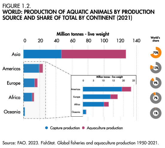 The increase in numbers are “largely due to the growth of aquaculture in Asia and of capture fisheries in the Americas.” Taking a look at what this means in terms of production per region, “Asia accounted for 70% of the world production of aquatic animals, followed by the Americas (13%), Europe (9%), Africa (7%) and Oceania(1%),” according to FAO.