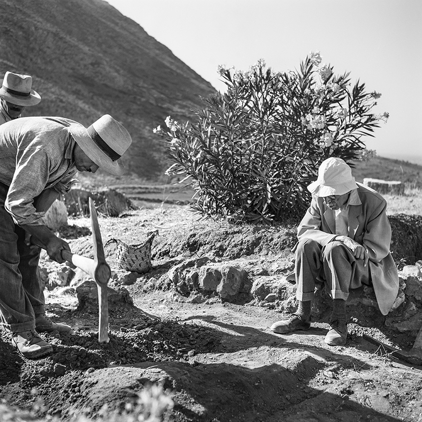 Alan Wace monitoring one of Mycenae’s skilled pickmen, Dimitris Papadopoulos, opening a new trench on the slope west of the modern road, across from the House of Shields and the House of the Oil Merchant.