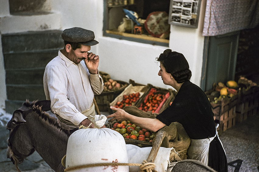 A shopkeeper in Mykonos, left, negotiates with a farmer who has brought his harvest to market with his donkey.