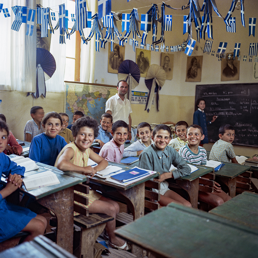 At a flag-bedecked school on the Cyclades island of Serifos, where pupils pose with their teacher.