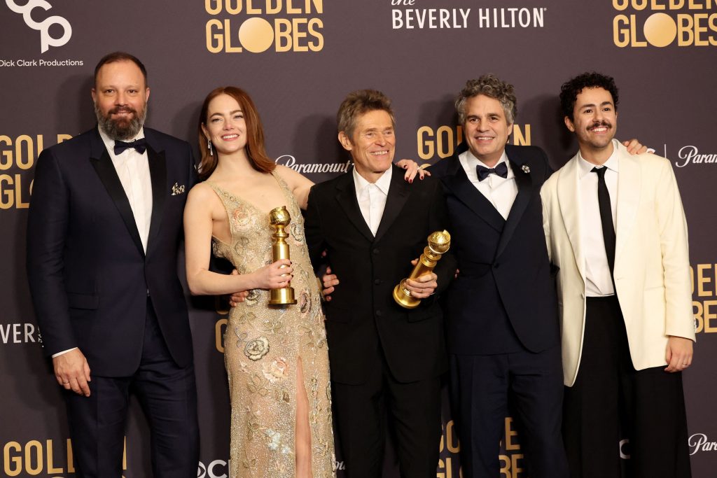 Greek filmmaker Yorgos Lanthimos (L-R), Emma Stone, Willem Dafoe, Mark Ruffalo and Ramy Youssef pose with the award for Best Motion Picture – Musical or Comedy award for ‘Poor Things’, and Best Performance by a Female Actor in a Motion Picture – Musical or Comedy for ‘Poor Things’ at the 81st Annual Golden Globe Awards in Beverly Hills, California on January 7, 2024. Photo: Reuters/Mario Anzuoni