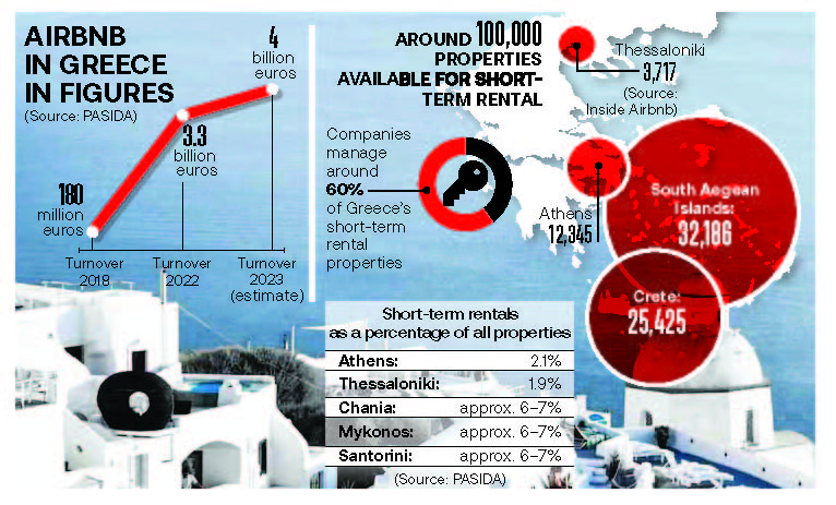 Airbnb has around 100,000 rooms, apartments and houses on its books around Greece. Downtown Athens alone has 12,345 properties, Thessaloniki 3,717 and Crete 25,425, with the number soaring to 32,186 for the South Aegean Region.