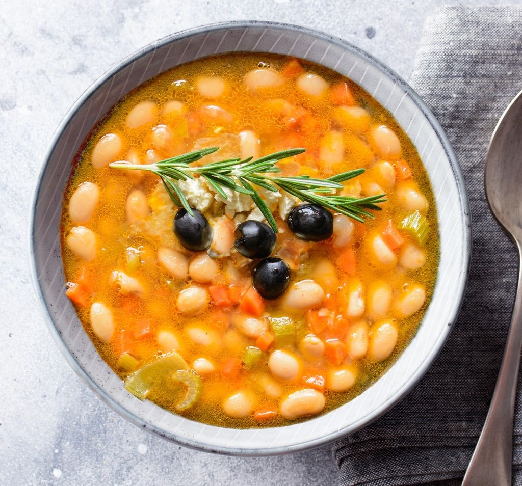 - Add more water if necessary. Add the olive oil, salt, pepper and continue cooking for 15–20 minutes more, until the soup is thick and creamy, and the beans and vegetables are tender. Serve with fresh bread, feta cheese and olives.