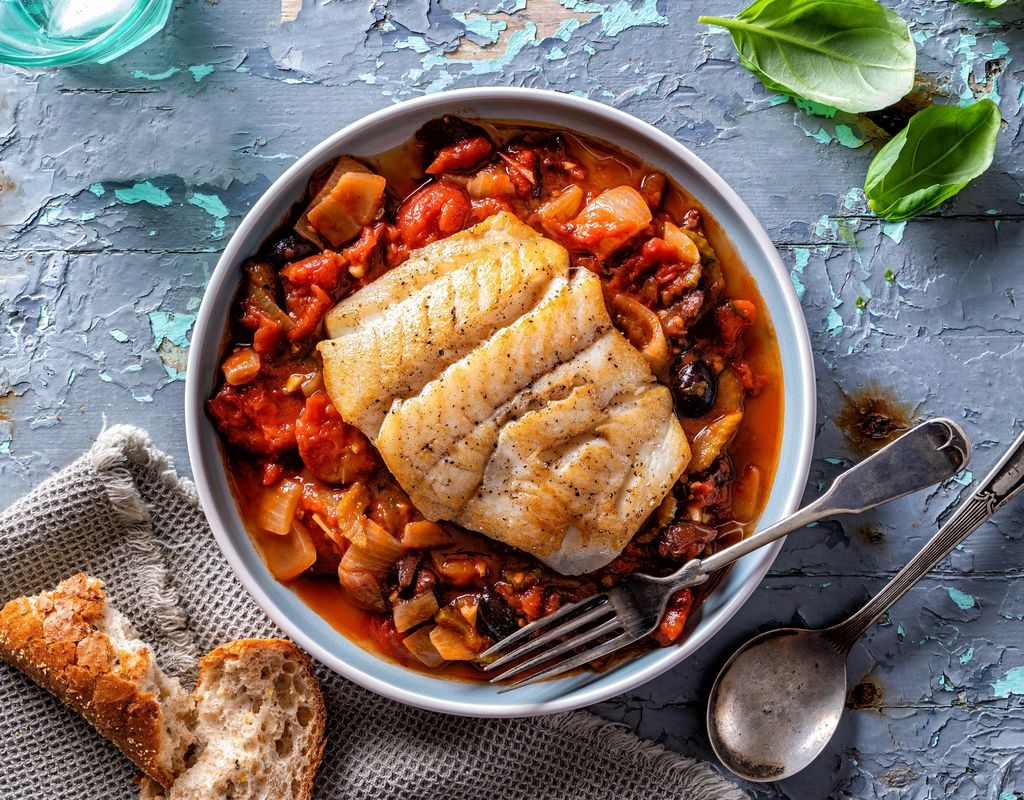Baked Greek Fish, tender fish, with tomatoes, onions and olive oil baked to perfection. Serve with crusty loaf of bread and some good quality feta for a complete hearty meal.