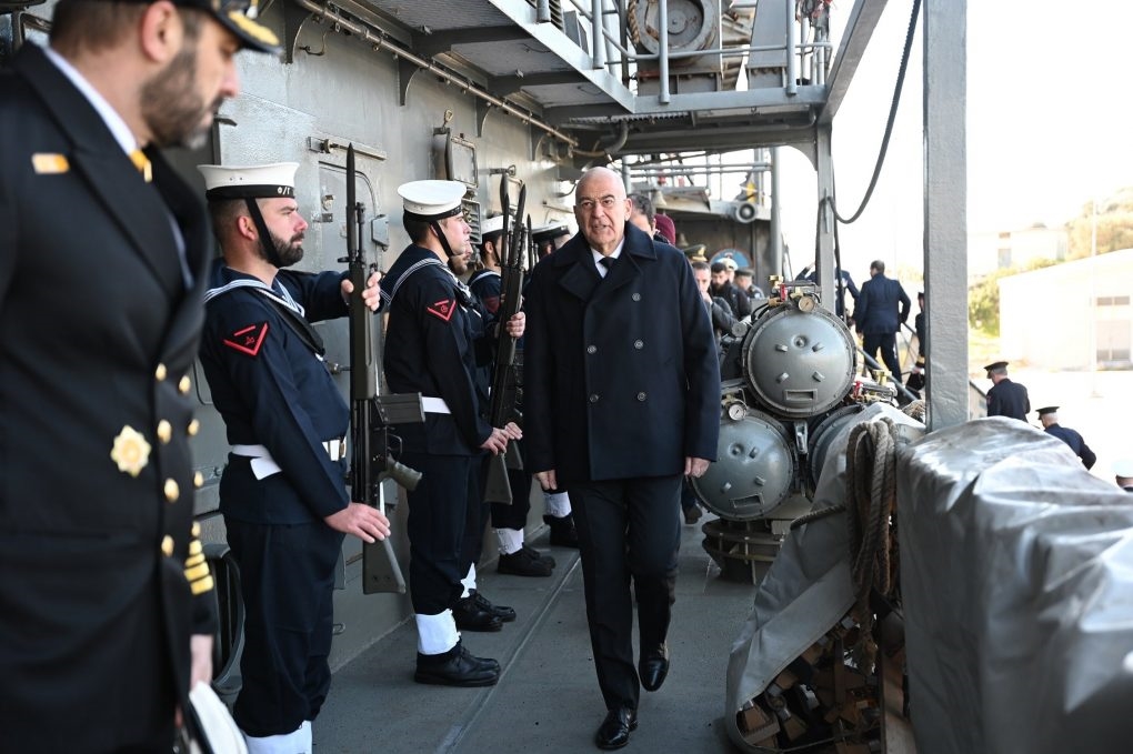 Greek Defense Minister Nikos Dendias during a recent inspection of the Hellenic Navy frigate “Hydra”.