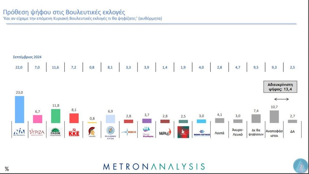 The latest edition of the monthly opinion poll by Metron Analysis shows a continued “free fall” for main opposition SYRIZA party, while political forces to the right of ruling New Democracy (ND) continue to pool high numbers.