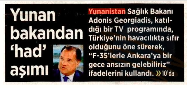 In one first reaction, the mass Turkish daily Miliyet, in a front-page reference, charged that the “the Greek health minister Adonis Georgiadis, in a television program … claimed that Turkey is a zero in (military) aviation and said the following: ‘With the F-35s, we can suddenly go one night to Turkey.”