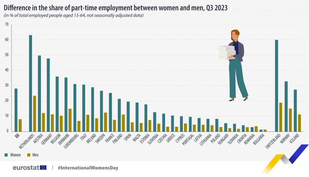 On a country level, data shows that the Netherlands had the highest share of women working part-time in Q3 2023, coming in at 63% of total employment against 23% for men, resulting in a 39 pp difference.