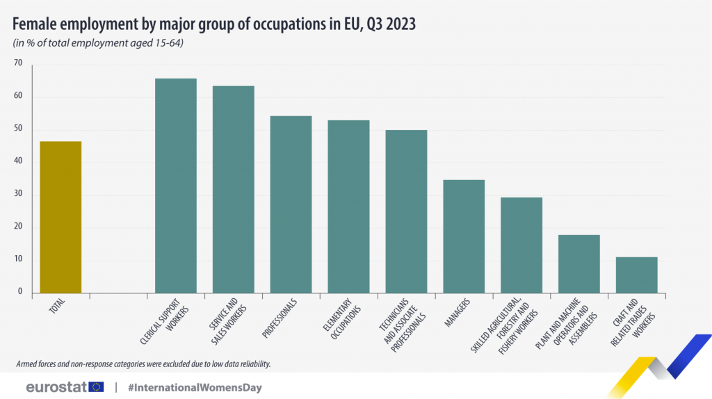 However, the graft above by Eurostat shows that only 34.7% of managers were women, and very few women are employed as trade workers (11.1%) and plant and machine operators (17.9%).