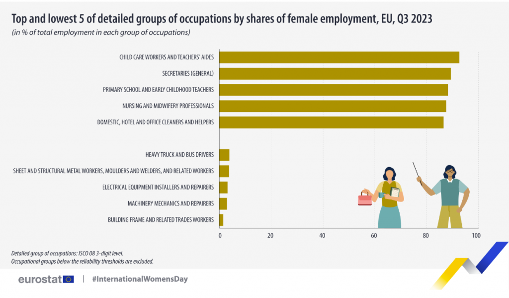 The gendered nature of employment in the EU becomes even more evident when looking at a detailed classification of jobs. A remarkable 92.6% of childcare workers and teachers’ aides are women, followed by secretarial positions at 89.3%, early childhood and elementary teaching positions at 88.2%, nursing and midwifery professionals at 87.5%, and finally domestic, hotel, and office cleaners and helpers at 86.5%.