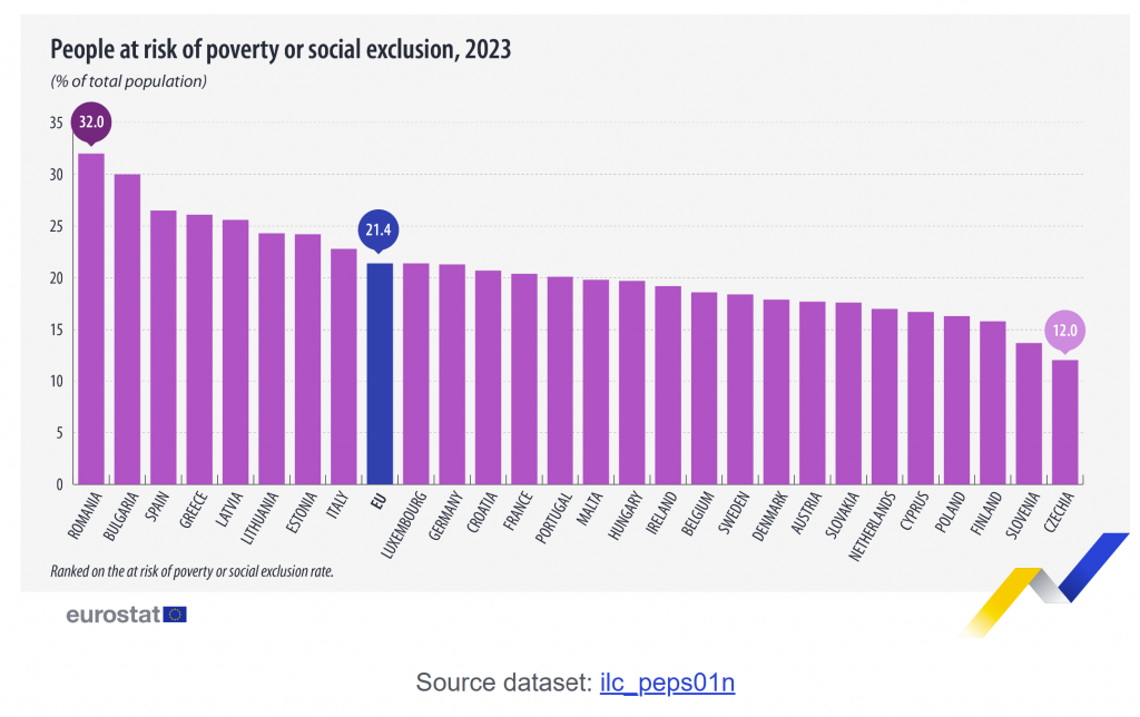 Eurostat defines “people at risk of poverty” as those living in households with at least one of the following three poverty and social exclusion risks: risk of poverty, severe material and social deprivation, and/or living in a household with very low work intensity.
