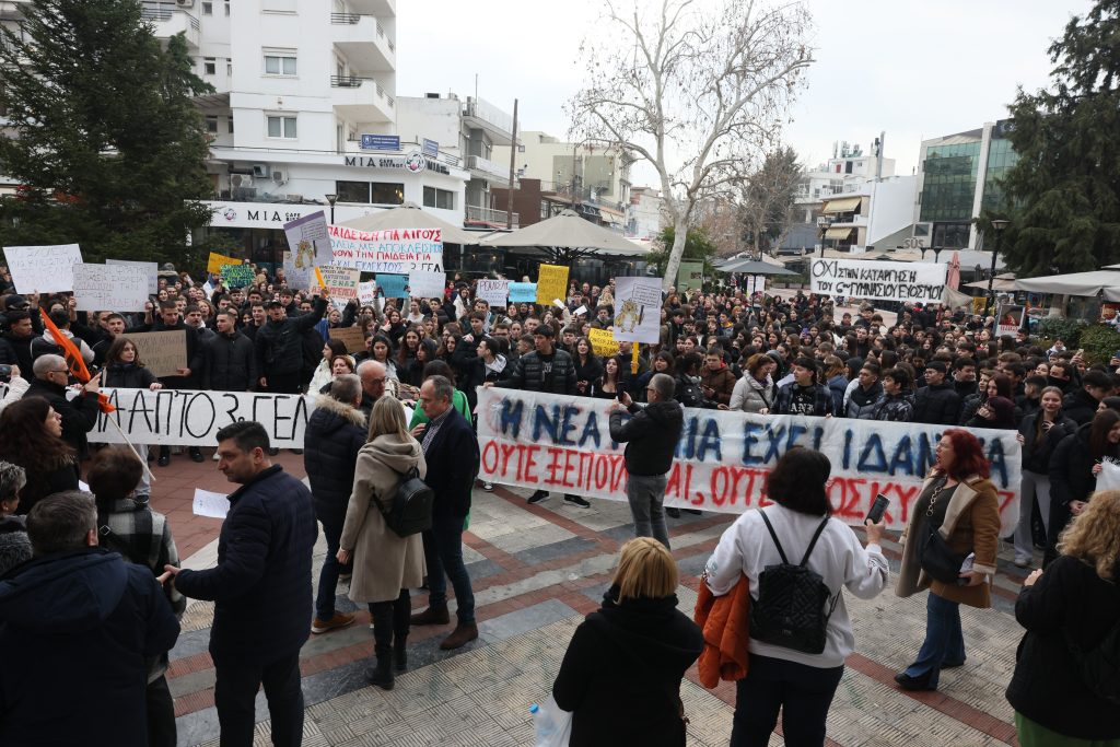 Protest march of students, teachers and parents of the 6th Gymnasium and the 3rd Lyceum of Evosmos from the school to the Town Hall for their transformation into a “Onassis Public School”, Monday 27 January 2025.