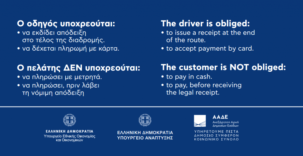 The sticker placed prominently on the rear door indicates in Greek and English informs users that the driver is obliged to issue a receipt at the end of the route and to accept payment by card. It goes on to note that customers are not obliged to pay in cash or to pay before receiving a legal receipt.