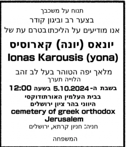 A memorial service for Karussis, who studied architecture at an Israeli university, took place in his ancestral Thessaloniki the same day.
