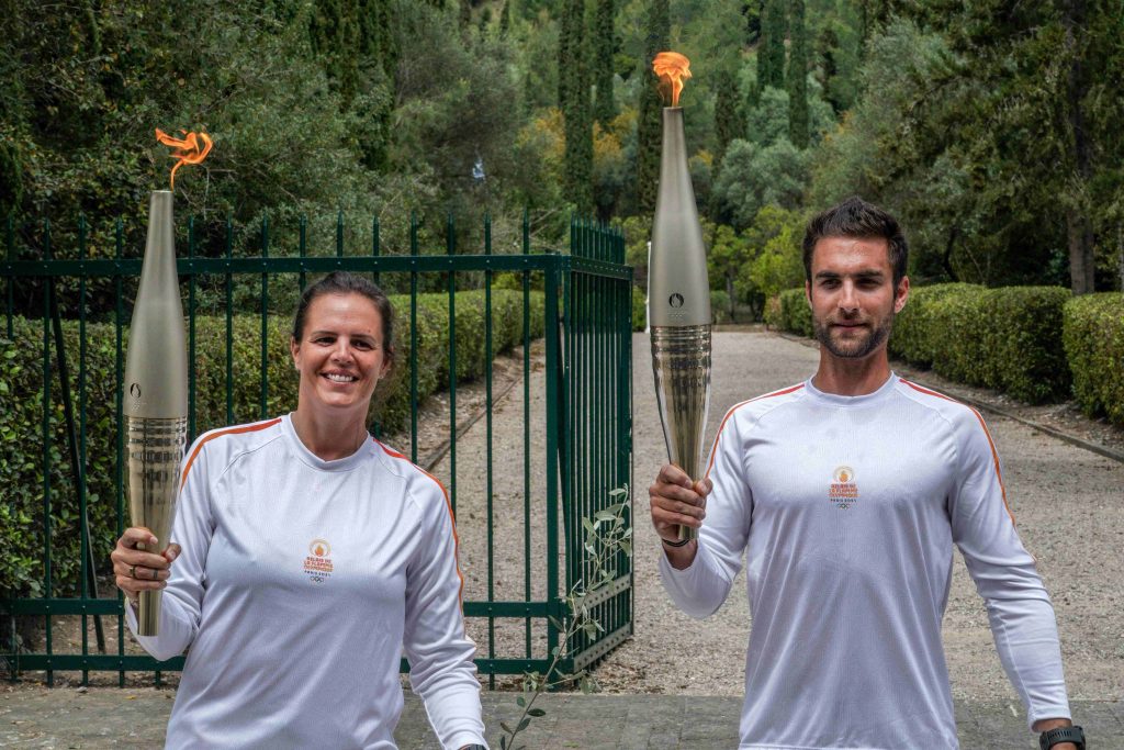 First torchbearer, 2020 Olympic gold rower Stefanos Douskos hands over the flame for the Paris 2024 Olympic Games to French swimmer Laure Manaudou who won her first Olympic title in the 400m freestyle at the 2004 Athens Olympics. in Olympia, on April 16, 2024.