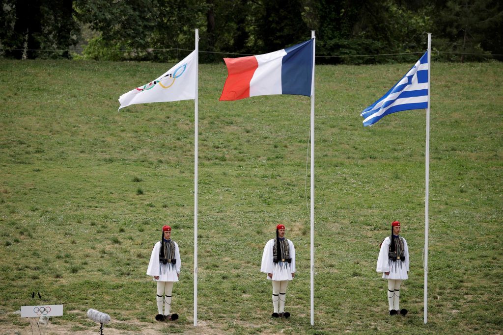 Paris 2024 Olympics – Olympic Flame Lighting Ceremony – Ancient Olympia, Greece – April 16, 2024 Members of the Presidential Guard stand to attention as the Olympic, French and Greek flags are raised during the Olympic Flame lighting ceremony for the Paris 2024 Olympics REUTERS/Louisa Gouliamaki