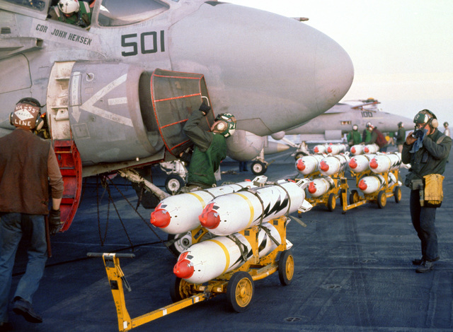 Flight deck crewmen from Attack Squadron 55 (VA-55) prepare an A-6E Intruder aircraft for an air strike against targets in Libya. Bomb skids loaded with CBU-59 cluster bombs are staged in front of the aircraft. April 15 1986 The U.S. National Archives
