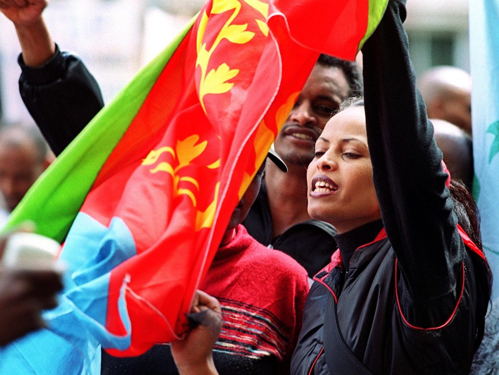 An Eritrean demonstrator waves her national flag and chants “We want peace” outside Downing Street in London as she and several hundred others hold a protest 19 May 2000. The group earlier faced-off with a another group from Ethiopia about the renewal of war on the border of their homelands. EPA PHOTO AFP/JONATHAN UTZ/utz/ao