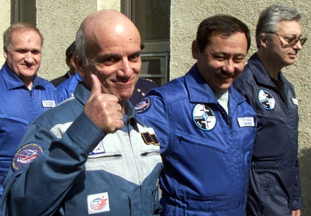 U.S. space tourist Dennis Tito (L) gives the thumbs up next to Talgat Musabayev (C) and Yuri Baturin as they head to a training session at the Baikonur cosmodrome, April 25, 2001. Californian millionaire Tito, together with two Russian cosmonauts Baturin and Musabayev, is to be launched to the International Space Station on April 28, 2001. REUTERS/Sergei Karpukhin