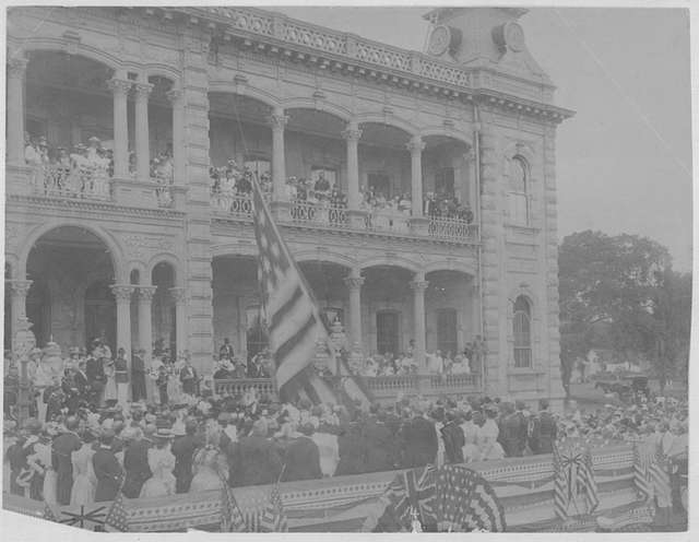 Annexation of Hawaii. Raising the American flag at Iolani Palace, Annexation ceremony. Hawaii State Archives