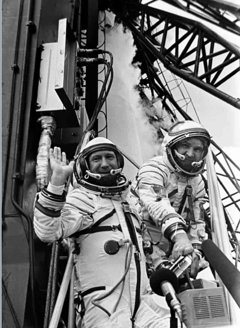 Aleksej A. Leonov (left) and Valeri Kubasov ahead of the launch of Soyuz 19, July 15, 1975. Soyuz 19 was part of the Apollo-Soyuz Test Project. NASA
