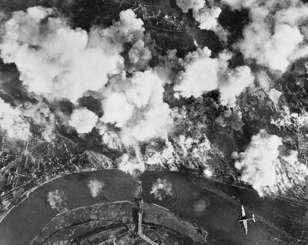 Vertical aerial photograph taken over the Mulheim district of Cologne, Germany, during a heavy daylight raid, showing a Handley Page Halifax flying southwards over the River Rhine, as clouds of smoke rise from targets bombed on the west bank. Two daylight raids on this date completely devastated the Mulheim and Zollstock districts, causing much damage to domestic property as well as industrial premises, power stations, railways and harbour installations. Picryl