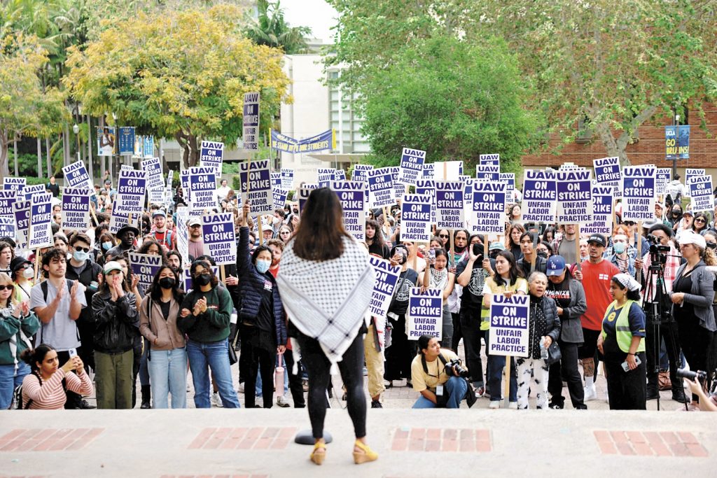 Unionized academic workers, upset about the University of California’s response to pro-Palestinian protests at various campuses, hold placards as they strike at the University of California Los Angeles (UCLA) in Los Angeles, California, U.S., May 28, 2024. REUTERS/Mike Blake