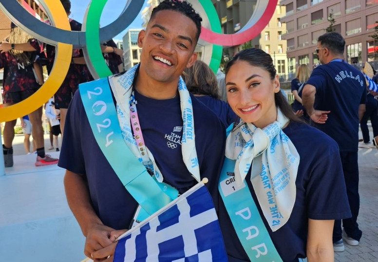 Greece’s flag-bearers at the Closing Ceremony of the 2024 Olympic Games in Paris, Bronze medalist pole vaulter Emmanouil Karalis and artistic swimmer Evangelia Platanioti.