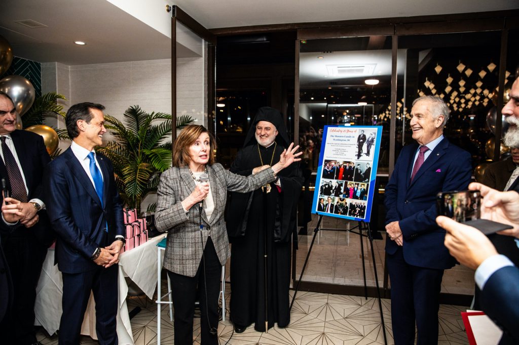 (L-R) Mike Manatos, Speaker Emerita Nancy Pelosi, Archbishop Elpidophoros, and Andy Manatos at the Celebration of 40 years of Manatos& Manatos. Credit: Manatos & Manatos.