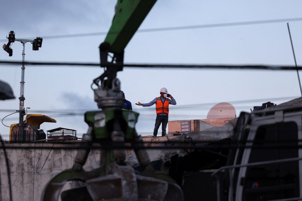 A man wearing vest and helmet gestures while using a cellphone during the recovery efforts at the site of the collapsed Jet Set nightclub in Santo Domingo, Dominican Republic, April 9, 2025. REUTERS/Ricardo Arduengo