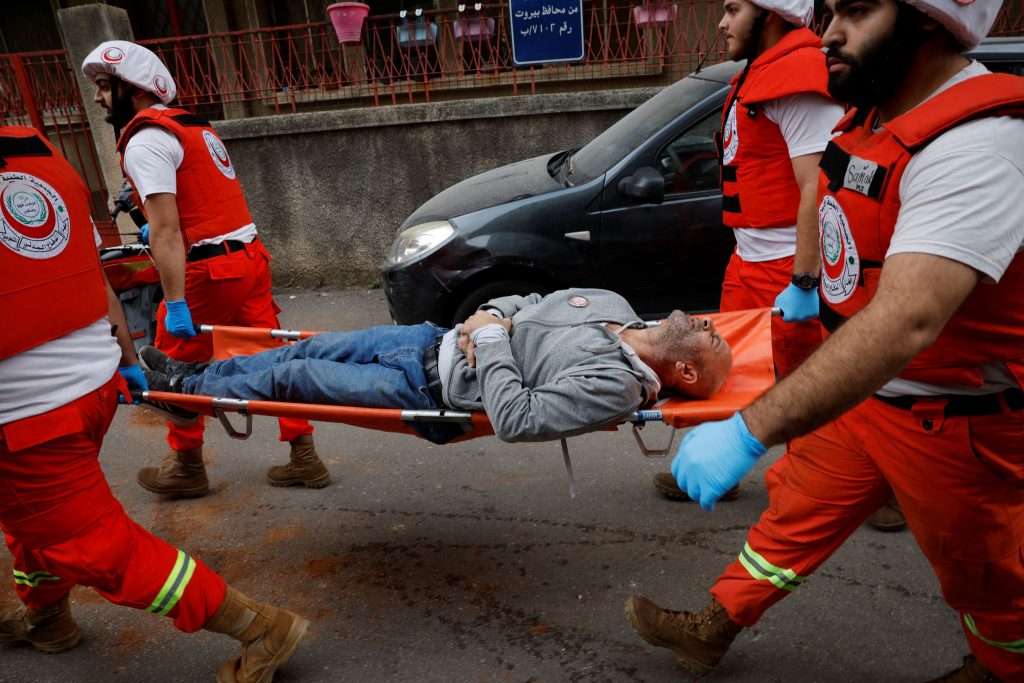 A man is carried on a stretcher at the site of an Israeli strike on a building, that according to security sources killed Hezbollah’s media relations chief Mohammad Afif, in Ras Al- Nabaa, Beirut, Lebanon November 17, 2024. REUTERS/Adnan Abidi