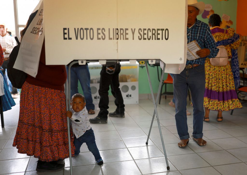 A child holds on to a voting booth as its mother and other Raramuri Indigenous people vote at a polling station during Mexico’s general election, in Norogachi, in the state of Chihuahua, Mexico, June 2, 2024. The writing on the booth reads “The vote is free and secret.” REUTERS/Jose Luis Gonzalez
