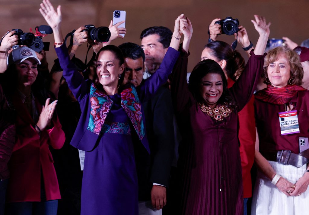 Claudia Sheinbaum and MORENA party winner for Mexico City mayor Clara Brugada gesture to supporters after Sheinbaum was declared the winner of the presidential election according to the INE electoral institute’s rapid sample count, in the Zocalo plaza in Mexico City, Mexico June 3, 2024. REUTERS/Daniel Becerril