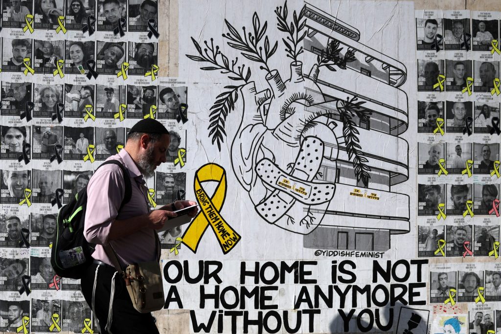 A man walks next to memorial pictures of hostages, most of whom were kidnapped during the deadly October 7 attack by Hamas, in Tel Aviv, Israel, September 4, 2024. REUTERS/Florion Goga