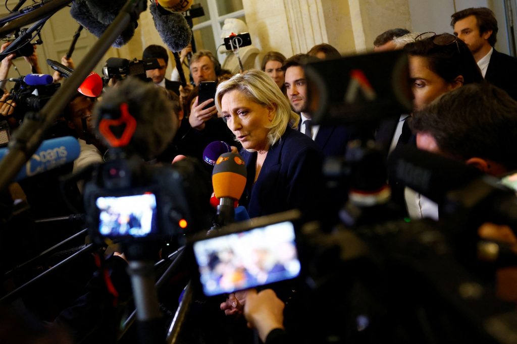 French far-right leader and member of parliament Marine Le Pen, President of the French far-right National Rally (Rassemblement National – RN) party parliamentary group, talks to journalists after the announcement by the French Prime Minister of the use by the French government of article 49.3, a special clause in the French Constitution, to push the budget bill through the National Assembly without a vote by lawmakers, during a debate on the 2025 Social Security Financing bill (PLFSS) at the National Assembly in Paris, France, December 2, 2024. REUTERS/Sarah Meyssonnier