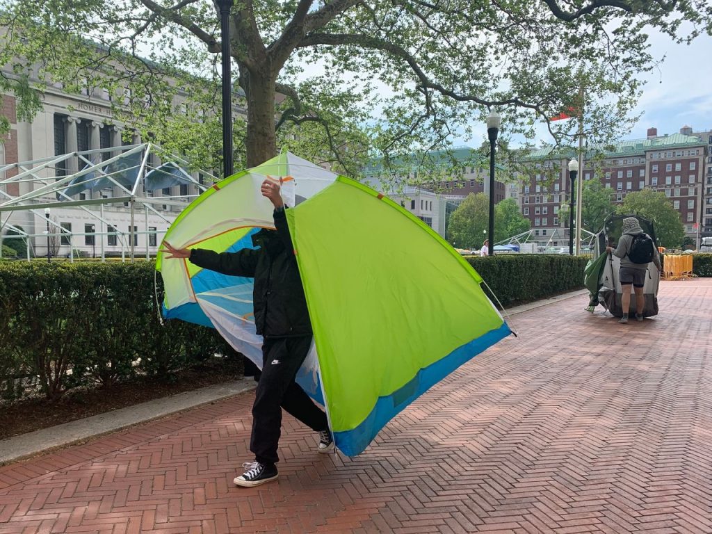 Protester moves a tent on Columbia University campus Tuesday. PHOTO: ERIN AILWORTH/THE WALL STREET JOURNAL