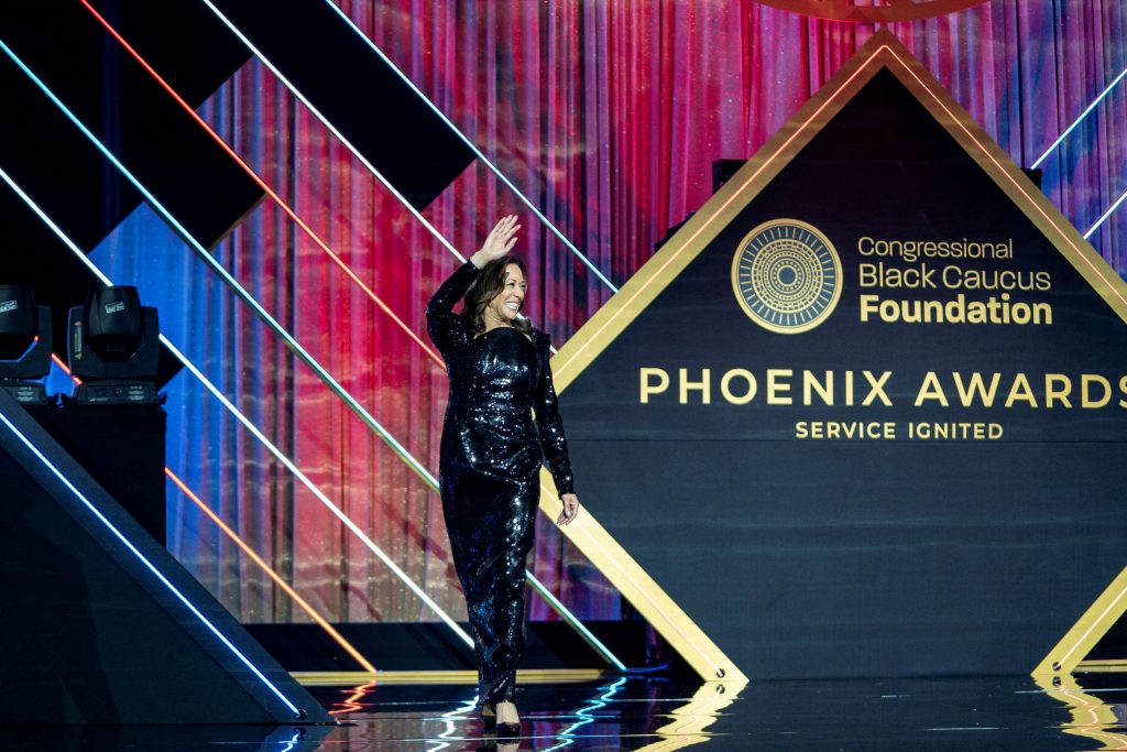 Democratic presidential nominee and U.S. Vice President Kamala Harris arrives on stage at the Congressional Black Caucus Foundation’s Phoenix Awards dinner at Walter E. Washington Convention Center in Washington, U.S., September 14, 2024. REUTERS/Bonnie Cash