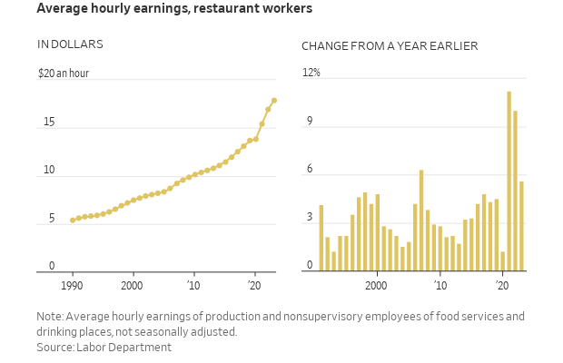 The surge in restaurant and bar worker wages since 2021 followed years in which their hourly earnings ticked up by an easier to manage 2% to 4% annually.