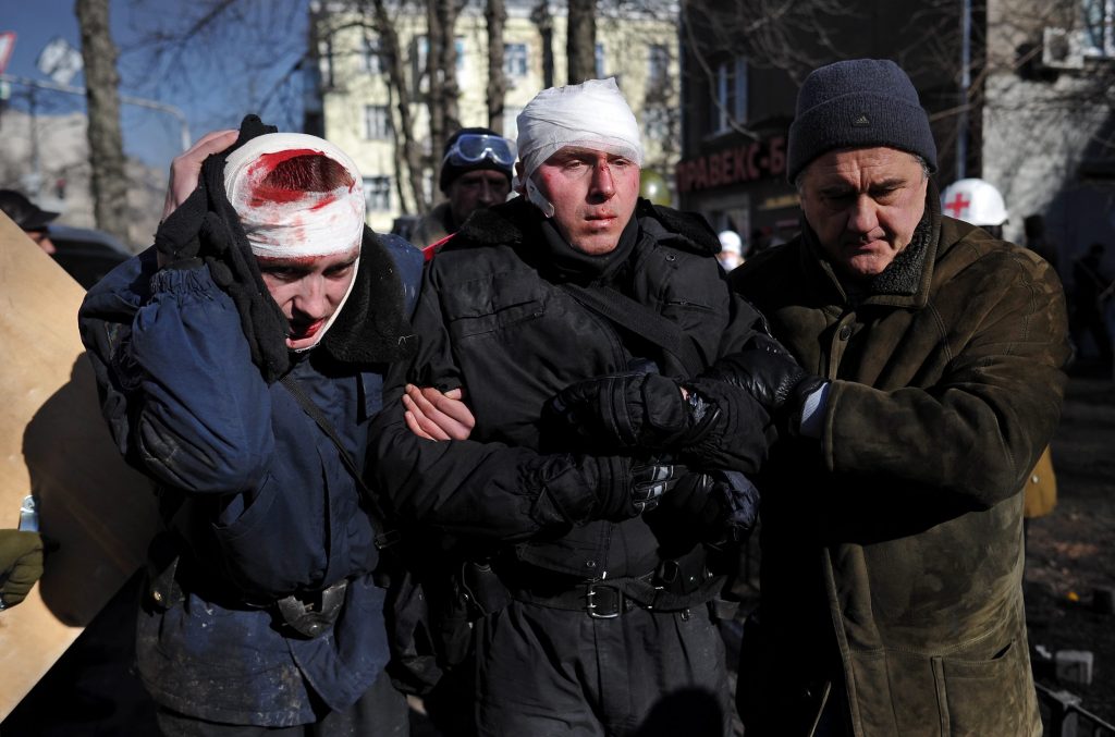 Two wounded policemen are guided to the ambulance cars during an anti-government protest in downtown Kiev, Ukraine, 18 February 2014. Violence erupted in the Ukrainian capital after anti-government protesters broke through a police cordon in front of parliament. Protester marched toward the parliament to demand constitutional reforms that would curb the powers of President Viktor Yanukovych. Ukraine has been mired in political crisis since November after the government backed away from a trade agreement with the European Union and signed a 15-billion-dollar loan deal with Russia instead. EPA/ALEXEY FURMAN