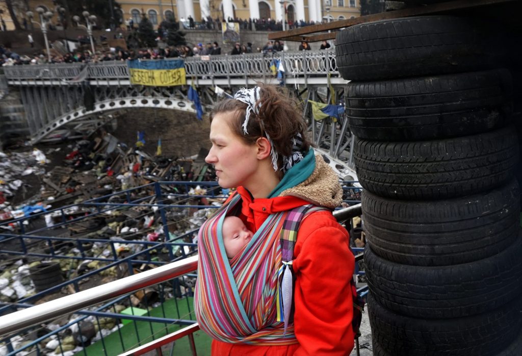 A young Ukrainian woman stands next to a barricade on Institutskaya street in downtown of Kiev, Ukraine, 23 February 2014. Protesters took full control of the Yanukovych residence and provided free access of the premises for Ukrainian and the media. Deposed Ukrainian President Viktor Yanukovych and security forces deserted the capital Kiev as protesters on 22 February moved to secure state institutions and parliament took steps towards forming a transitional government. EPA/MAXIM SHIPENKOV