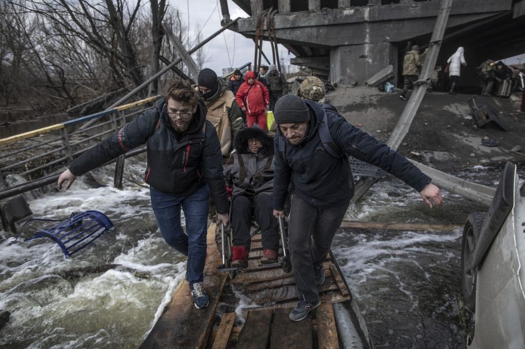 Ukrainian civilians carried a woman on a wheelchair across a river to help her escape from the partially occupied town of Irpin on March 7, 2022. PHOTO: MANU BRABO FOR THE WALL STREET JOURNAL