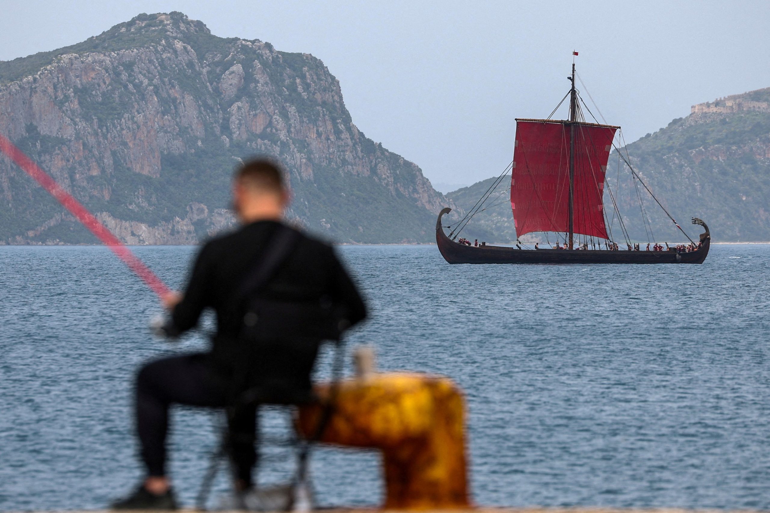 A yacht sails by a replica of an ancient warship, during the filming of The Odyssey, the latest project from director Christopher Nolan, in the town of Pylos, Greece, March 16, 2025. REUTERS/Louisa Gouliamaki