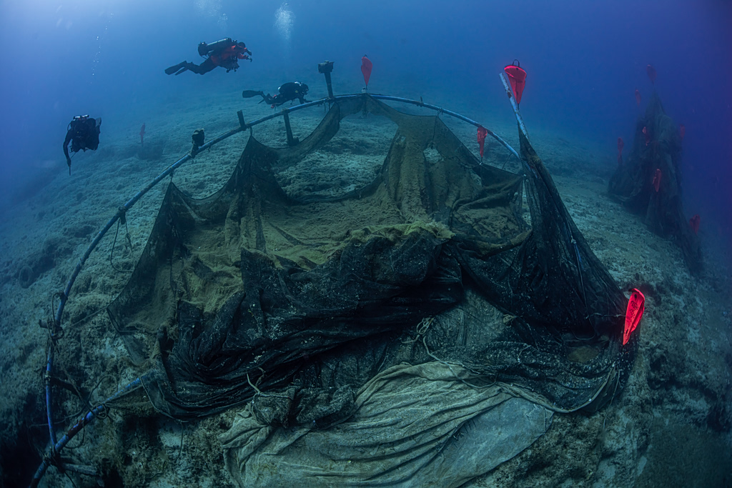 In these same waters, however, divers and cleanup groups are increasingly finding marine debris left behind by abandoned “ghost” fish farms. Nets, polysterene, rubber rings, rope- most of the fish farm waste is plastic. Over the past four years, NGOs and environmental foundations have removed 310 tons of such waste from “ghost farms” around Ithaca, Patras, Menidi, and Methana. Researchers say the debris they have discovered and removed is only a fraction of what remains.