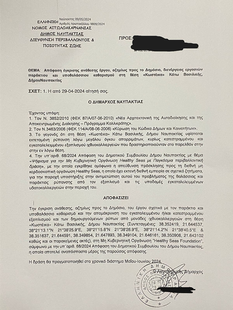 Official notification from the municipality of Nafpaktias granting Healthy Seas permission to conduct a clean-up of an abandoned fish farm. This clean-up eventually led to a legal dispute and accusation that Healthy Seas and OZON stole the equipment. Document provided by OZON.