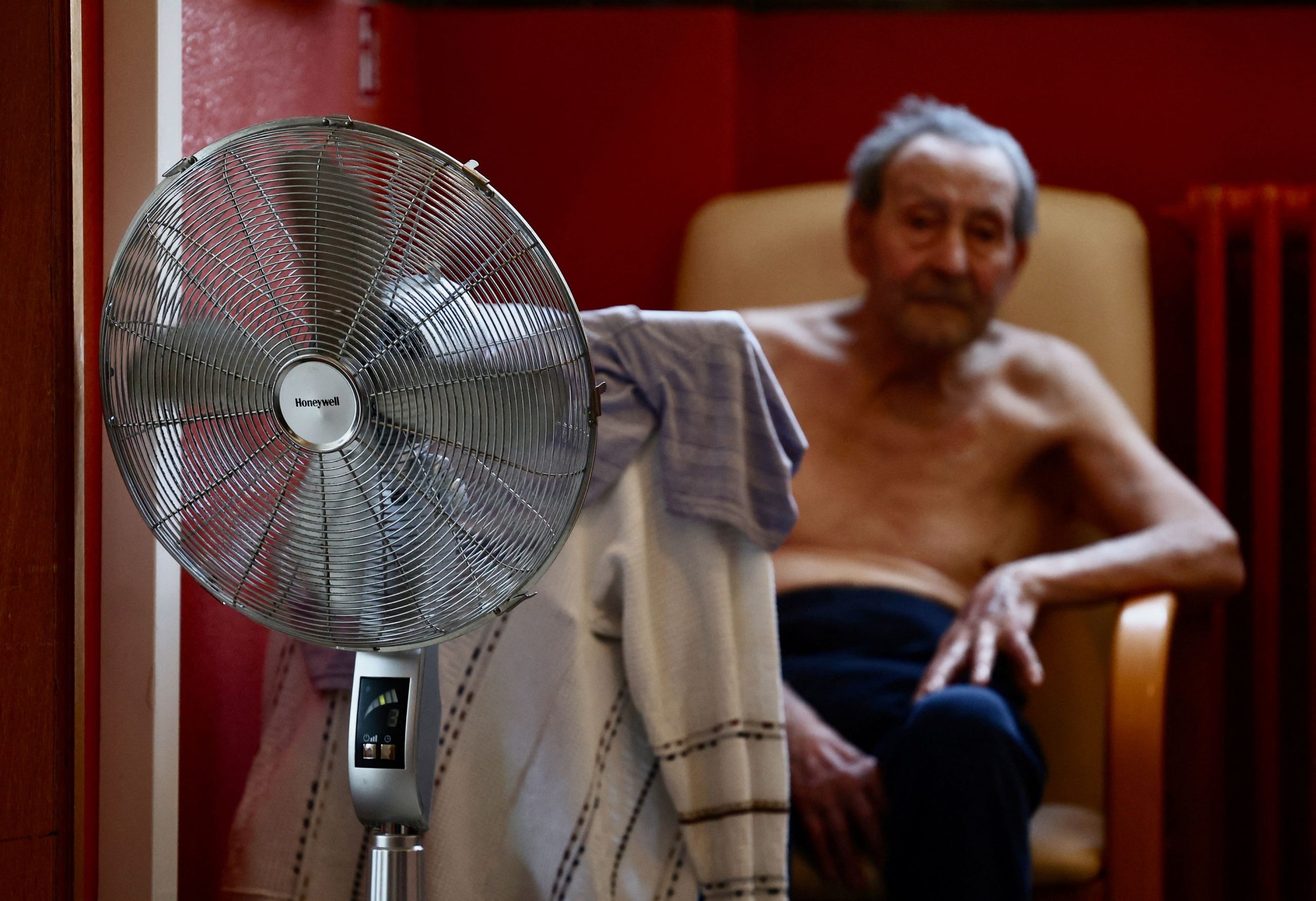A resident at the house for elderly persons, La Maison de Chatelet, sits next to a fan, as a heatwave hits Europe, in Chatelet, Belgium July 1, 2025. REUTERS/Yves Herman