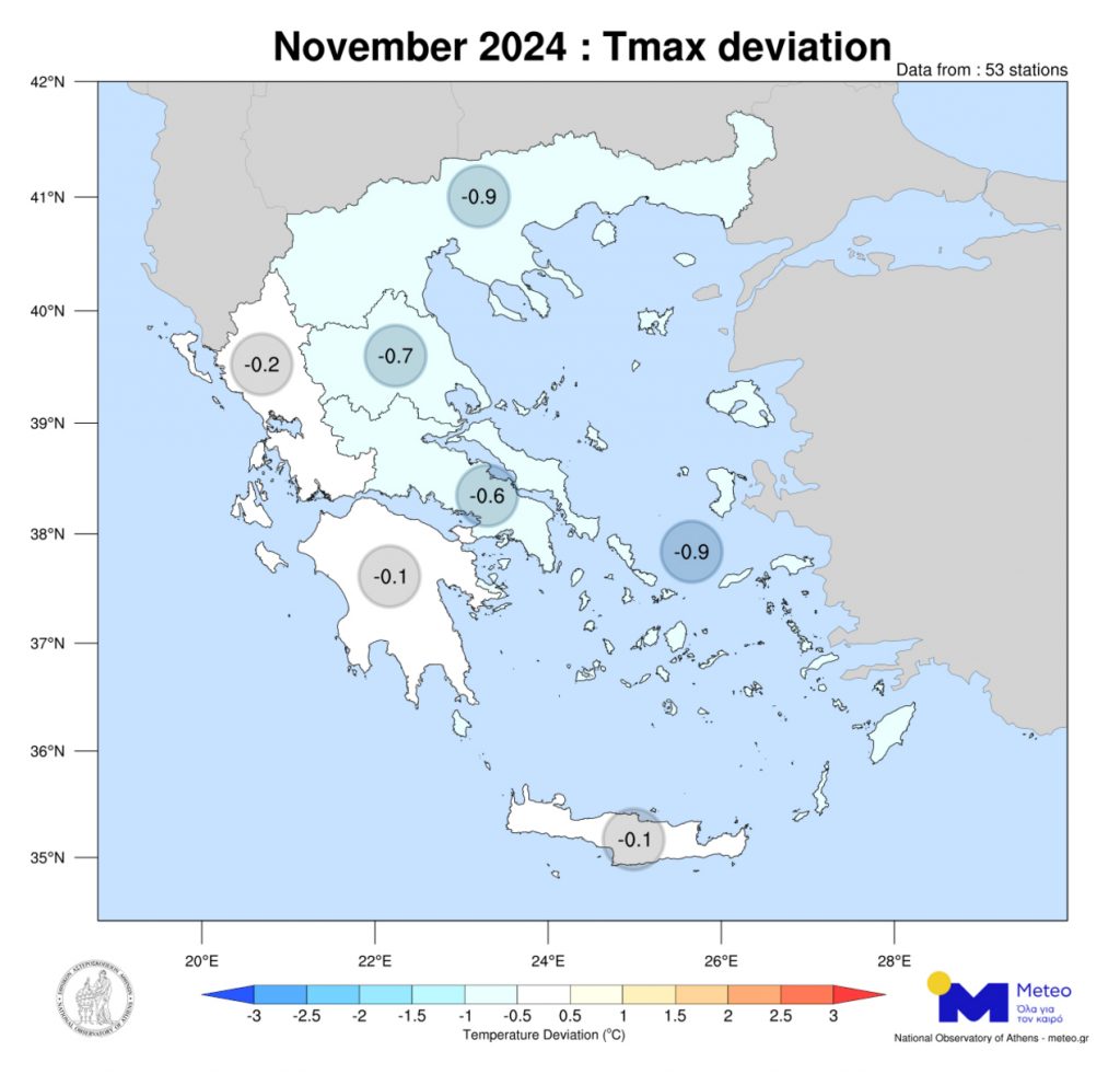 In his post, Lagouvaros explains that the average value of maximum daily temperatures in November was slightly below the seasonal averages in most parts of the country (compared to the 2010-2019 average).