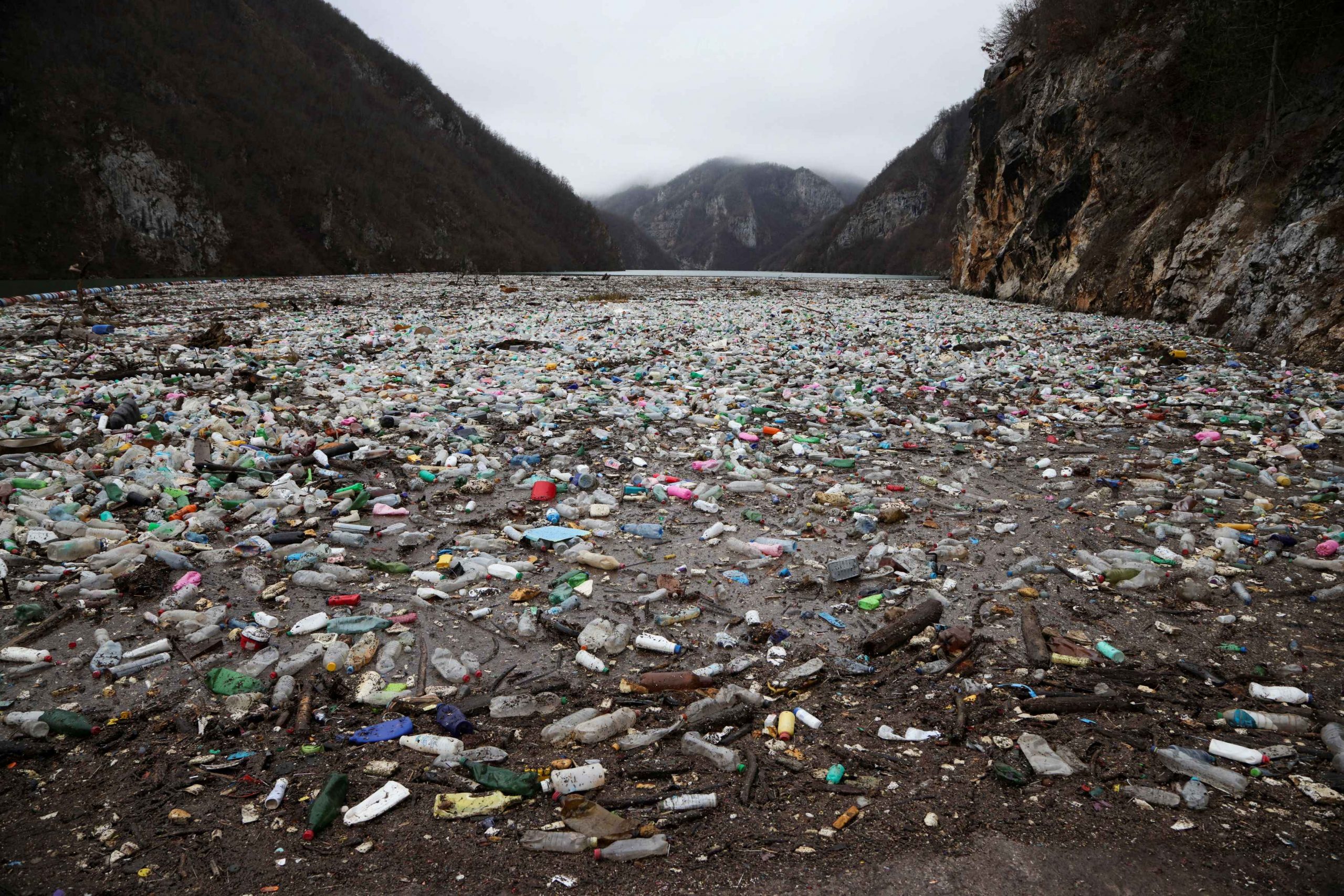And finally, images from the Drina river canyon in Visegrad, Bosnia & Herzegovina, show a giant 5,000 cubic meter floating waste dump. The garbage, which largely consists of plastic bottles originating upstream and sometimes even in different countries, floats downriver to Visegrad, where it is stopped by a makeshift barrier of oil drums designed to protect a nearby dam.