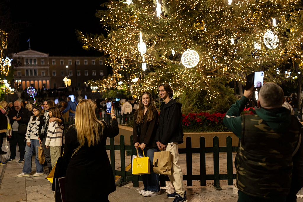People take photographs near the illuminated Christmas tree during Christmas festivities in Athens, Greece, November 30, 2025. REUTERS/Stelios Misinas