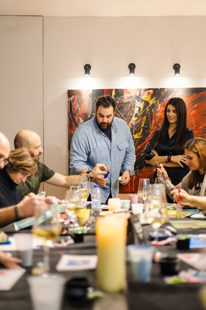 At the heart of Raptis’ practice is his Art and Wine workshop—a unique session that draws Athenians and travelers alike for two hours of relaxed painting, casual conversation, and a glass of wine.