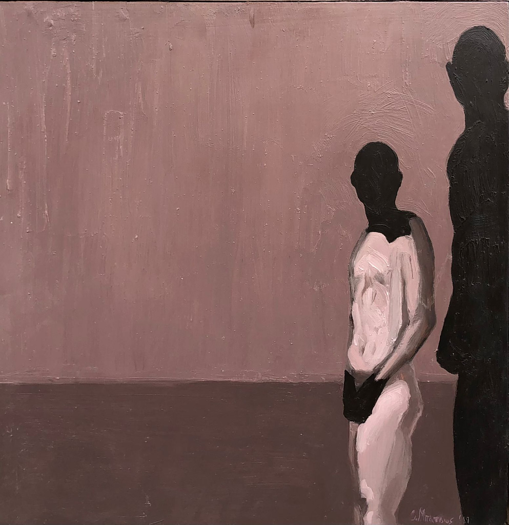 Mpatsios’ figures appear with a pared-down, almost solemn presence, as if engaged in a private dialogue. Instead of linear narration, the works dwell in a state of transition — where experience becomes memory and memory settles into calm awareness.